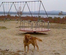 Here I am at the campsite in Acadia, Maine. My first big job on the trip. I guarded that campground with my life! I was constantly moving 'cause of all the land I had to cover in the park. Of course nothing happened to the family, I'm the fiercest guard dog ever! Good lookin' too. |