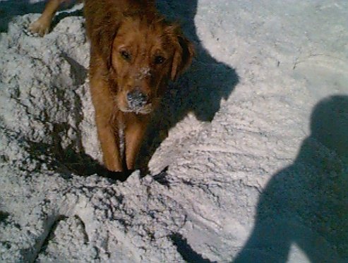 Look at that hole. Aside from being an awesome guard dog, I can landscape with the best of 'em! I dug this beaut at Ed Walline Park in the Florida panhandle. I was a little angry 'cause the family wouldn't let me lie on the beach blanket, so I threw some of the sand right on them. Right now I'm doing my best 'oh pleeeeease' expression hoping they'll either give me a treat or let me on that blanket! Pretty much the routine my days follow. |